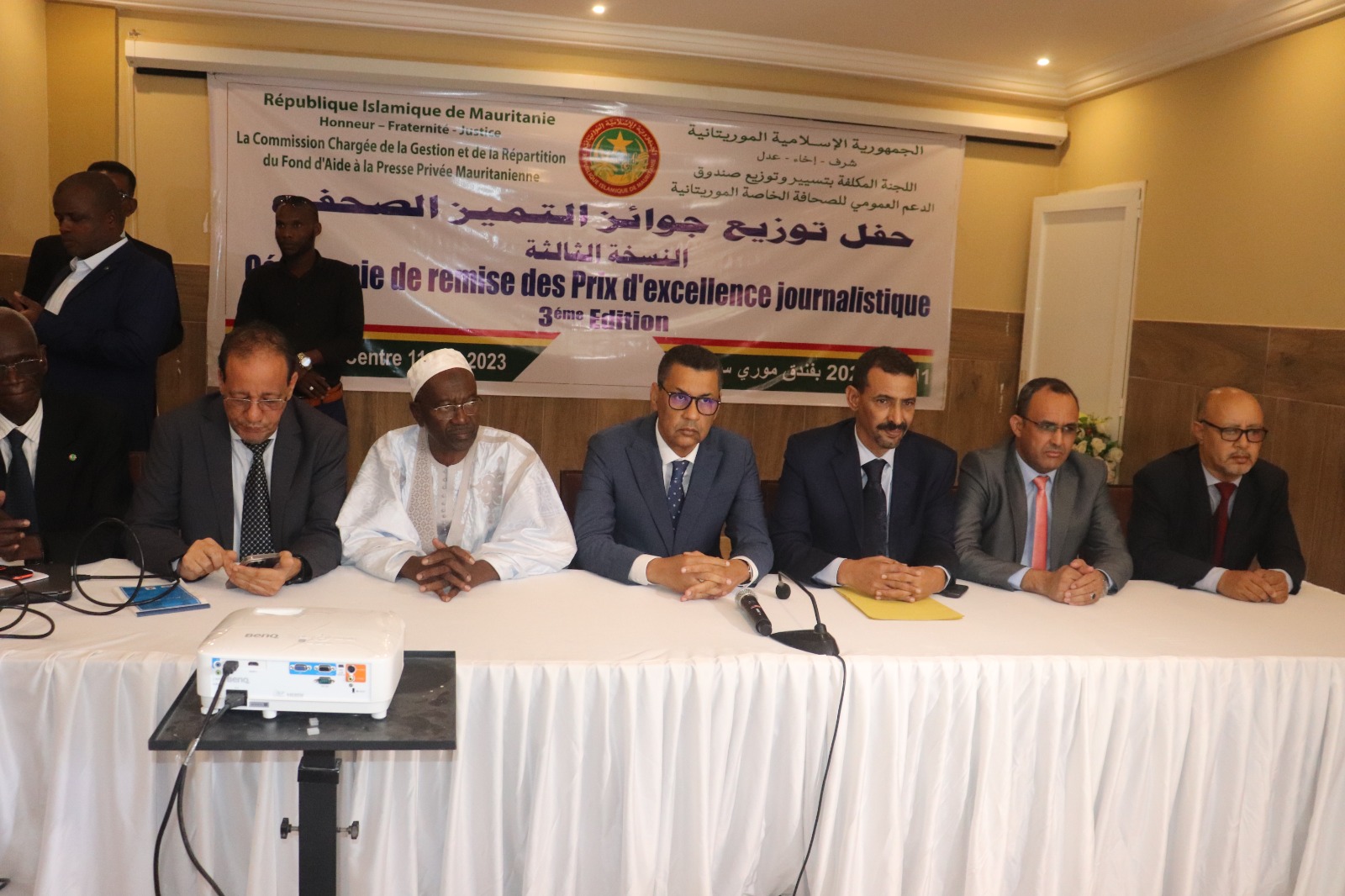 أشرف معالي وزير التعليم العالي والبحث العلمي، وزير الثقافة والشباب والرياضة والعلاقات مع البرلمان وكالة، السيد محمد الأمين ولد آبي ولد الشيخ الحضرامي، ورئيس السلطة العليا للصحافة والسمعيات البصرية السيد الحسين ولد مدو يوم الخميس في نواكشوط على حفل توزيع جوائز التميز الصحفي، المنظم من طرف اللجنة المكلفة بتسيير وتوزيع صندوق الدعم العمومي للصحافة الخاصة الموريتانية.