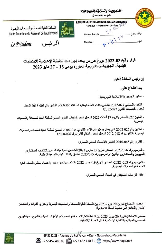 قرار رقم039-2023 س.ع.ص.س يحدد إجراءات التغطية الإعلامية للانتخابات