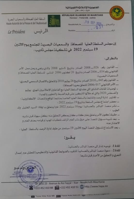 أصدرمجلس السلطة العليا للصحافة والسمعيات البصرية المجتمع اليوم الاثنين 19 سبتمبر 2022 في تشكيلة مجلس تأديب قرارا يقضي بتوجيه إنذارلمنصة المباشر بالحسانية وذلك عقب نشرها خبرا كاذبا
