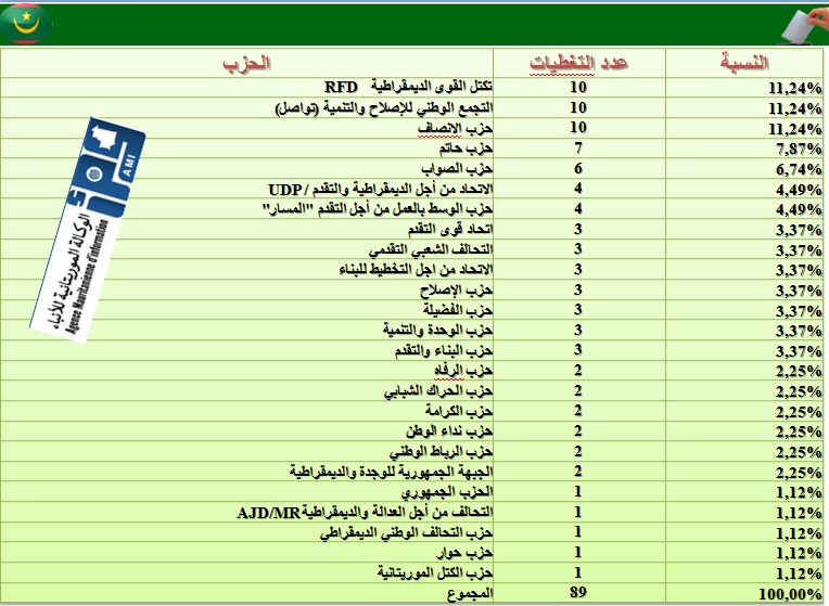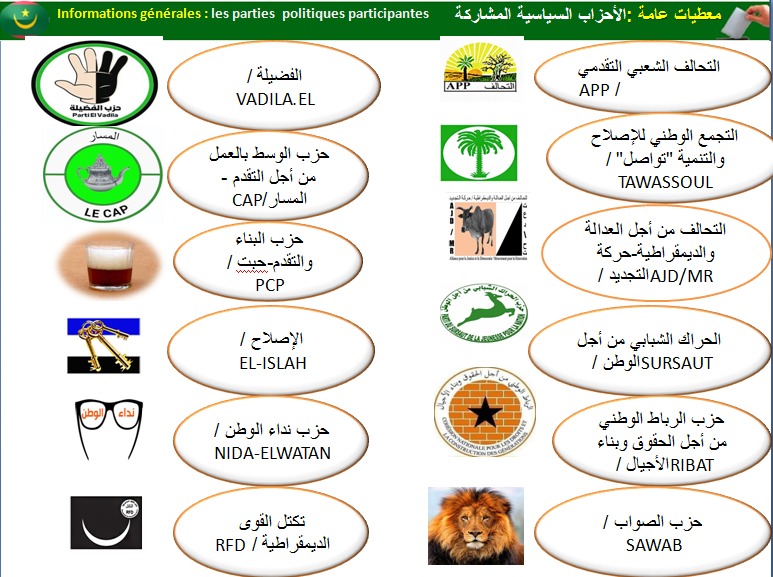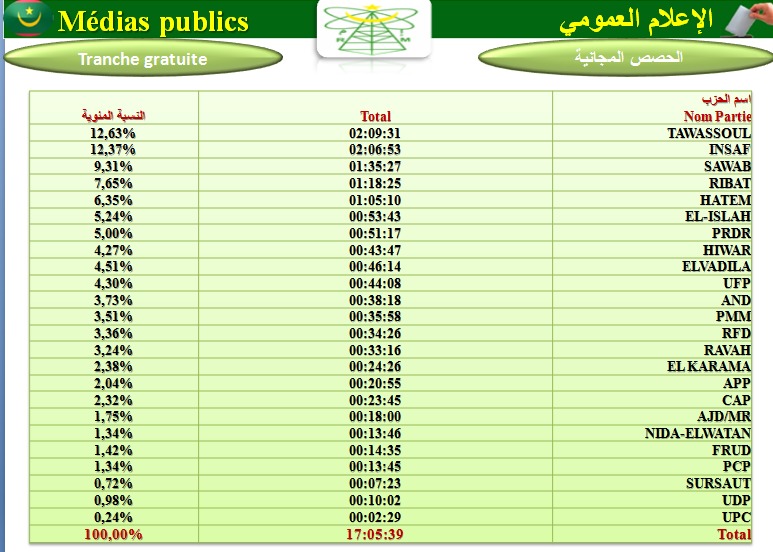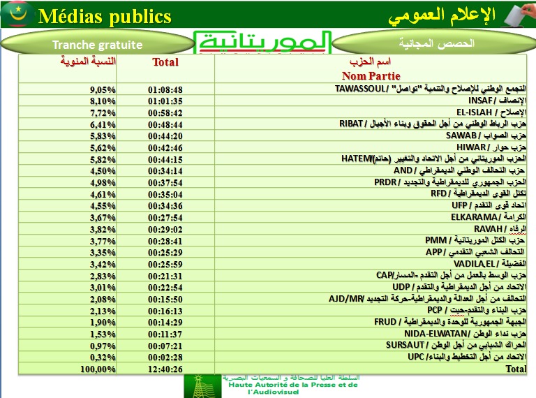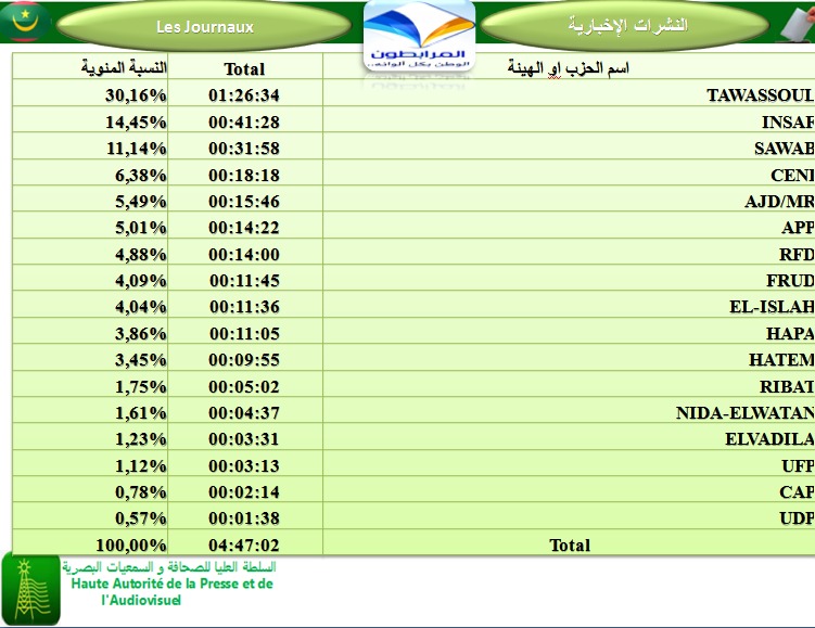 ووفرت جريدتا الشعب واوريزون الصادرتين عن الوكالة الموريتانية للأنباء صفحة في النسختين عربية الفرنسية لكل حزب وقد استخدم عشرة أحزاب حصتهم من الإعلانات بالجريدتين