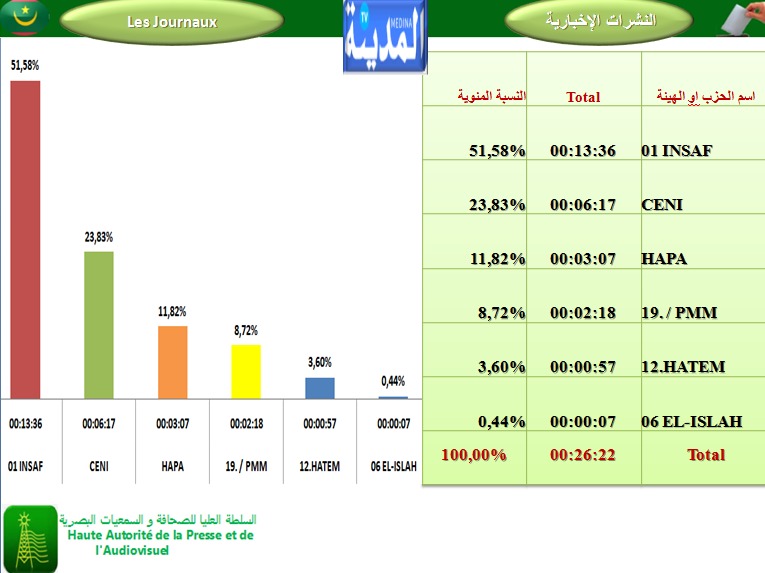 أصدرت السلطة العليا للصحافة والسمعيات البصرية مساء اليوم الجمعة نتائج عملية رصد التغطيات الإعلامية للحملة الانتخابية