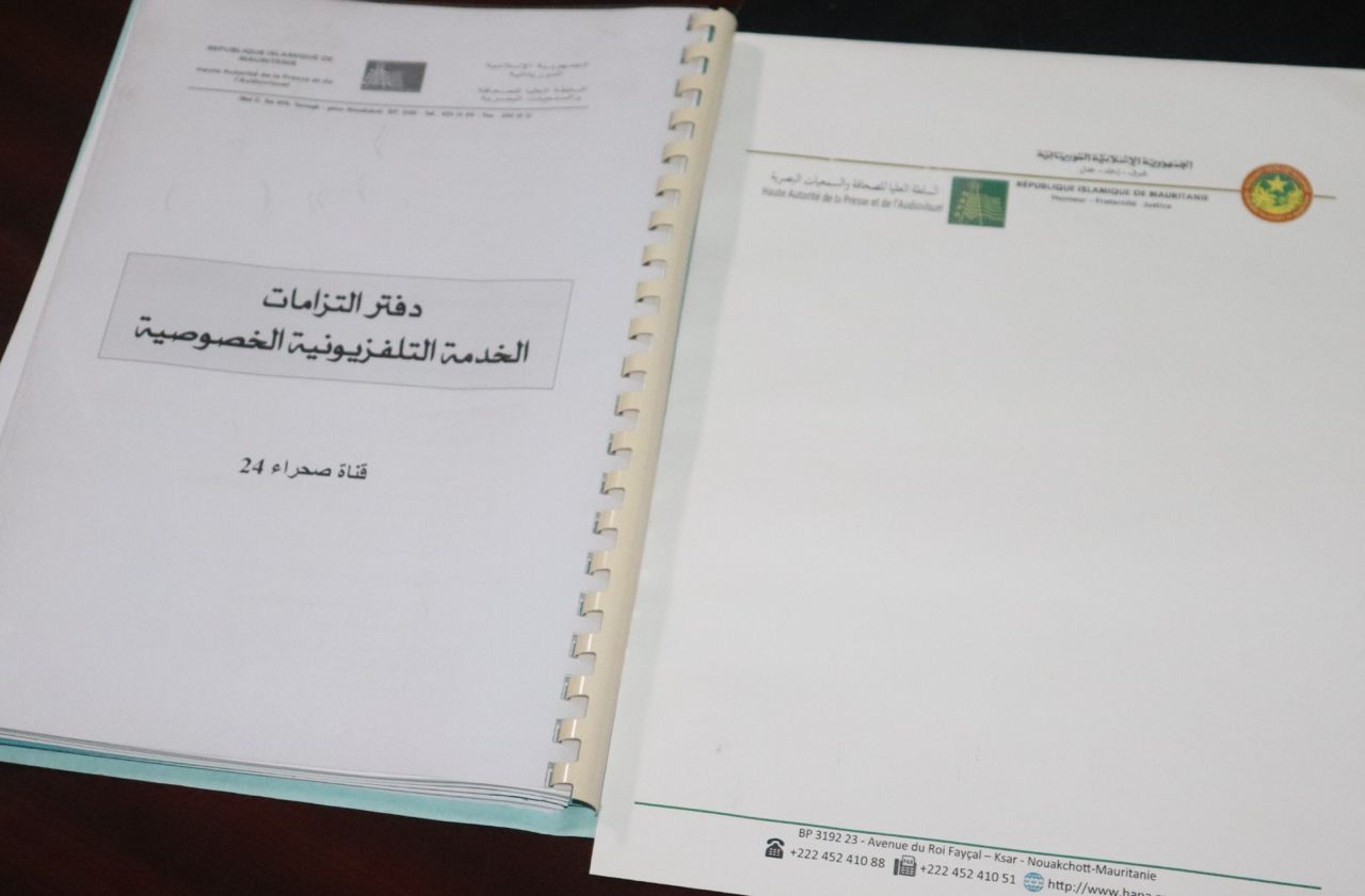 أشرف رئيس السلطة العليا للصحافة والسمعيات البصرية السيد الحسين ولد مدو اليوم بمكتبه على توقيع دفتر التزامات الخدمة التلفزيونية الخاصة صحراء 24