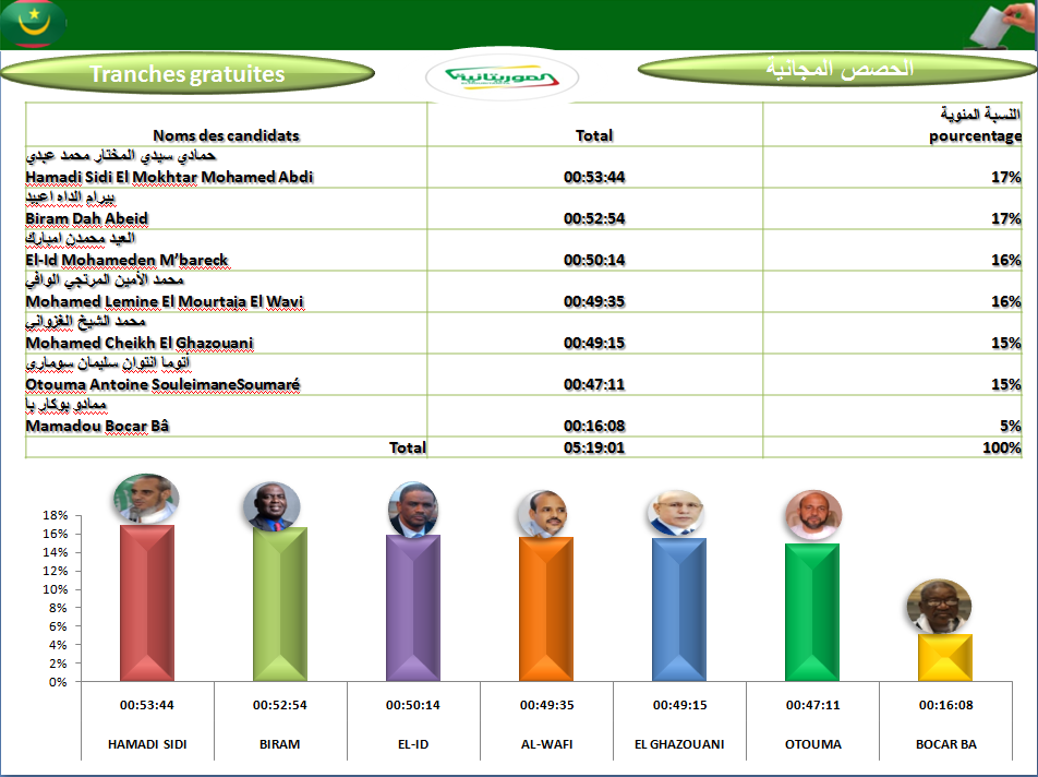 وتمكن وسائل الاعلام من الاضطلاع بدورها في مجال تنوير الراي العام والتثقيف الانتخابي واثارة الحوار بين المتنافسين شرحا لبرامجهم وتنويرا لناخبيهم، وتوفير فرق مصاحبة. للمترشحين واستديوهاتمجانية بوسائل الاعلام العمومية التلفزة واذاعة موريتانيا والوكالة. الموريتانية للانباءلتسجيل الحصص المجانية وزيادة اوقات وفضاءات الحصص المجانية 12 دقيقةيوميا بالاذاعةو8 دقائق بالتلفزةوصفحتان فييوميتي الشعب واوريزون الصادرتين عن الوكالة الموريتانية للأنباء فضلا عن تمكين المترشحين من. فرص اكثر لشرح برامجهم في النشرات الاخبارية