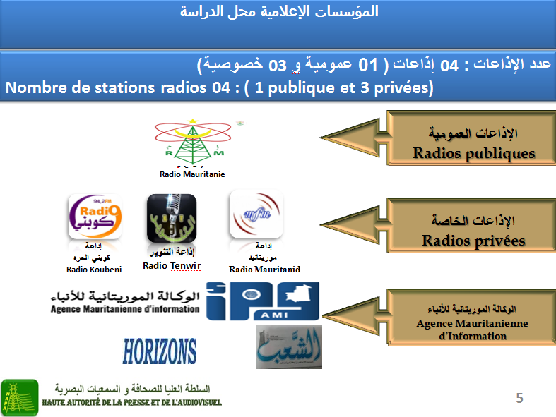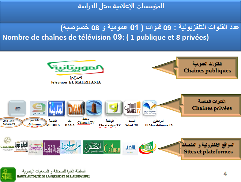 كشفت نتائج الرصد عن المساواة في نفاذ المترشحين لوسائل الاعلام العمومية، اذاعةموريتانيا، الوكالة الموريتانية للأنباء، التلفزة الموريتانية وعلى المستويات الثلاث الاخبارية والبرامجية والاعلاناتالمجانية.