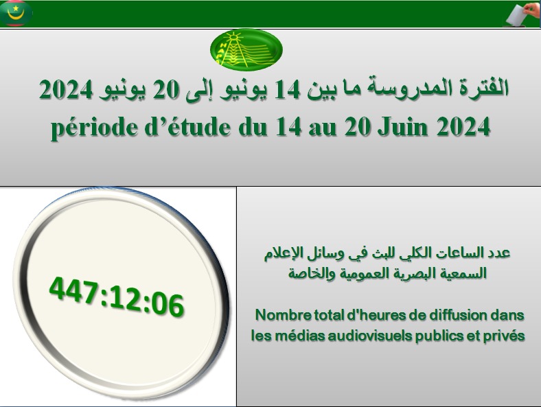 شملت عملية الرصد 447 ساعة و012 دقيقة و6 ثوان من البث الاذاعي والتلفزيوني وشمل الرصد جميع القنوات الإذاعية والتلفزية العمومية والخاصة والمواقع الالكترونية والمنصات ووسائل التواصل الاجتماعي والصحافة المكتوبة الخاصة والعمومية بموريتانيا